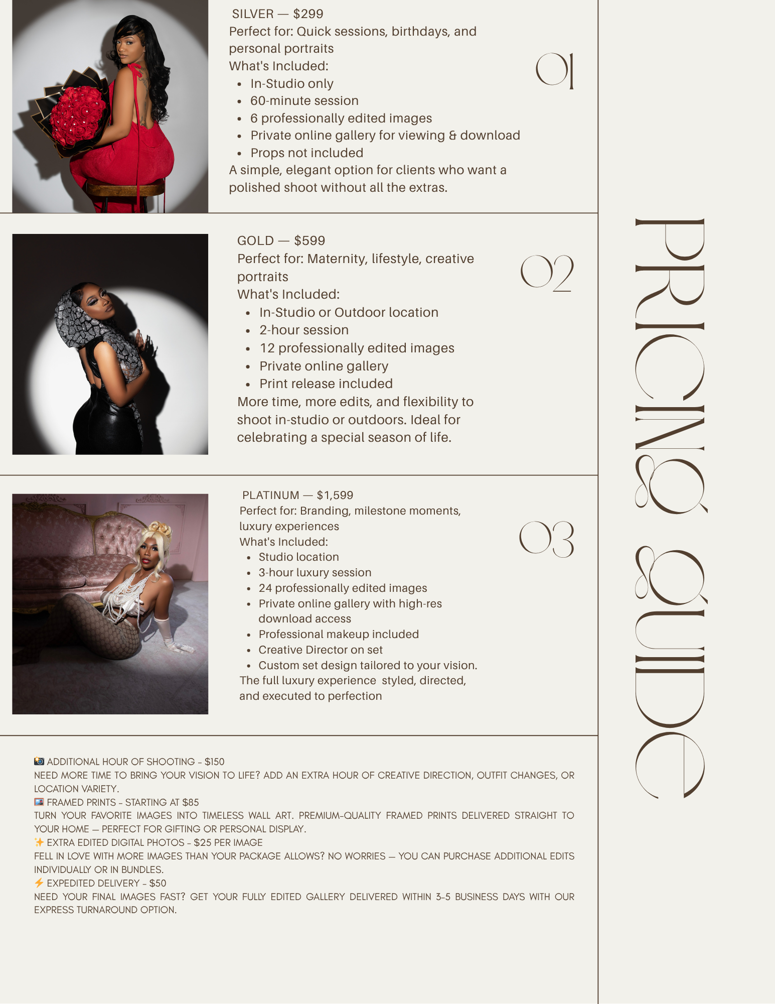 Same-day cancellations result in automatic forfeiture of your retainer. You will be responsible for rebooking and covering all new studio fees to schedule a future session.